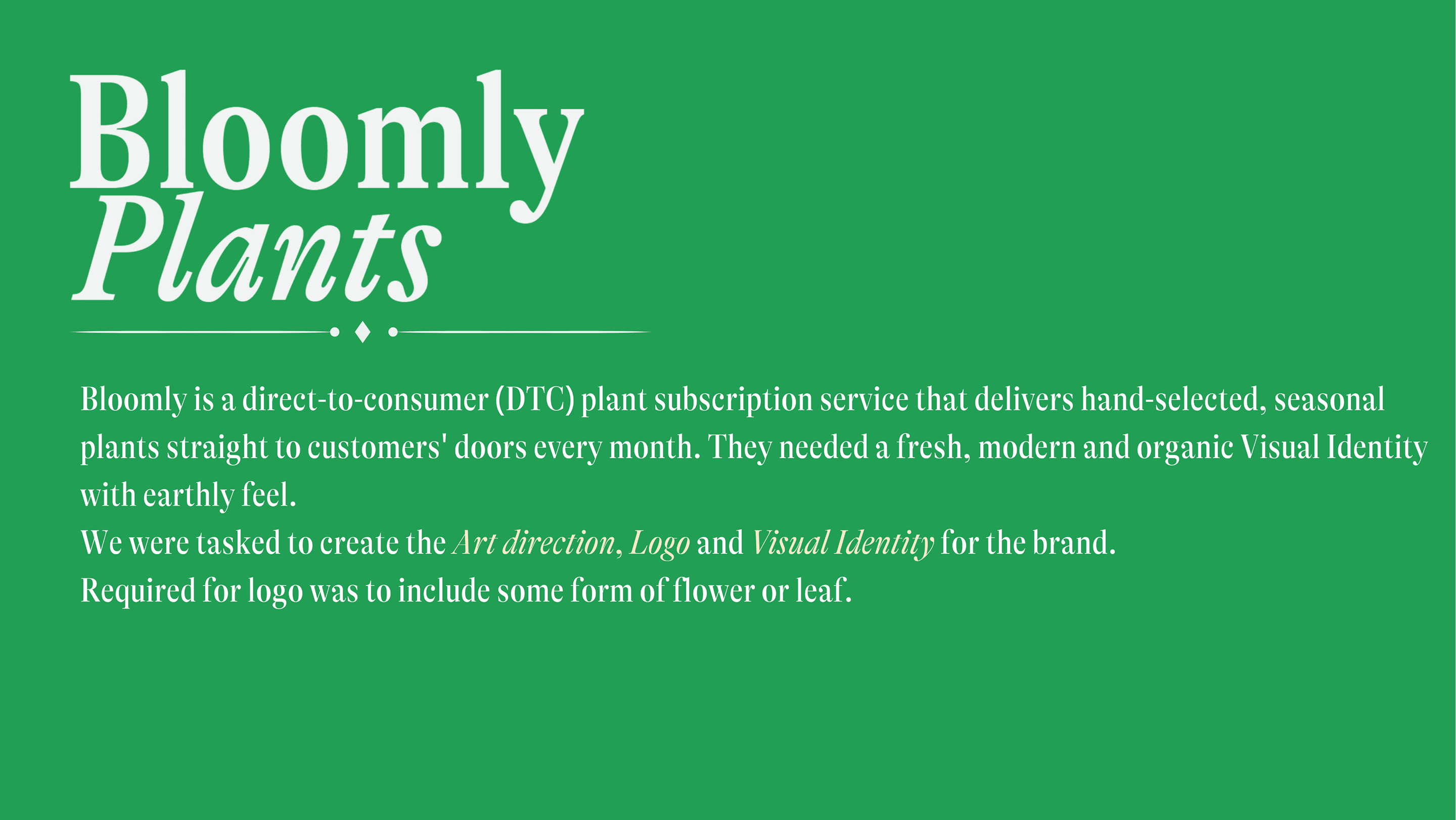 With Bloomly, the brief was to create a playful identity that feels warm and approachable to its core audience yet not too playful that it looks unserious and childish, as the target ideal customer profile is people interested in gardening with leaning towards females from age 20-40, living in the suburbs of North America.